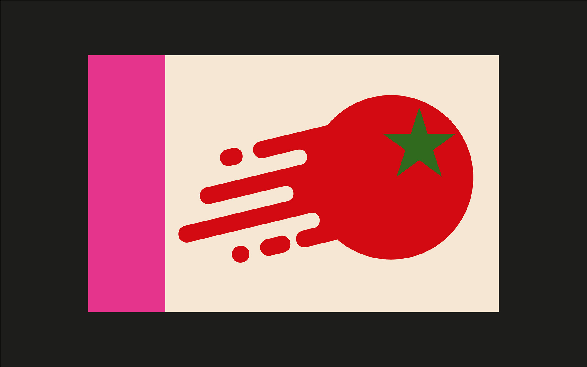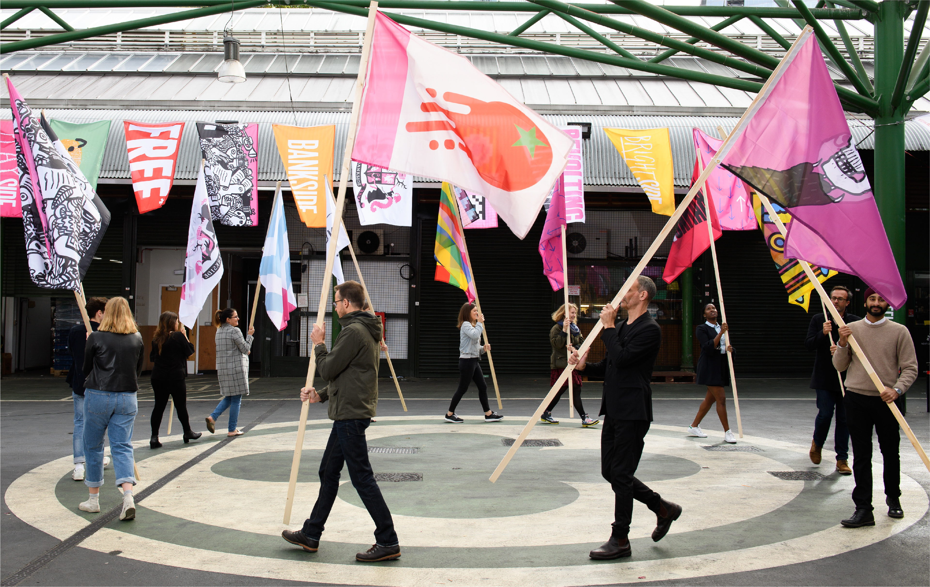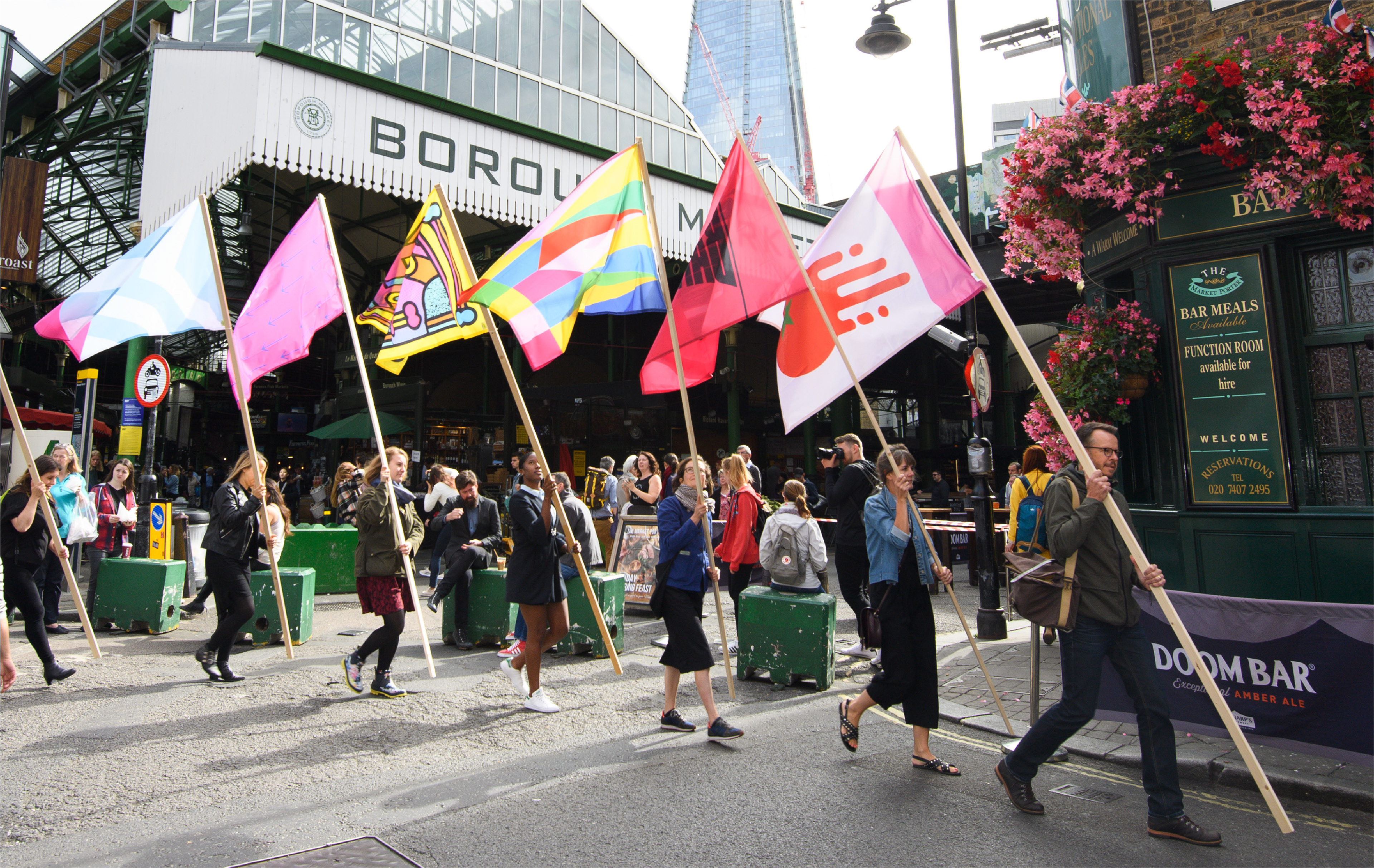 Flag design commissioned by NB Studio and Borough Market to celebrate the 'Independent Spirit of Bankside'. To answer the brief, with a nod to Borough Market, I used the idea of throwing food as a form of protest and designed a chucked tomato as a dynamic symbol of rebelliousness. The green calyx of the tomato is a star, evocative of revolutionary symbolism and flag graphics. The design also incorporates Bankside's pink colour along one edge to imply the location of the tomato-throwing culprit. Forty five flags by London designers were displayed in Borough Market during the London Design Festival. The flags were then auctioned in aid of local community charities.