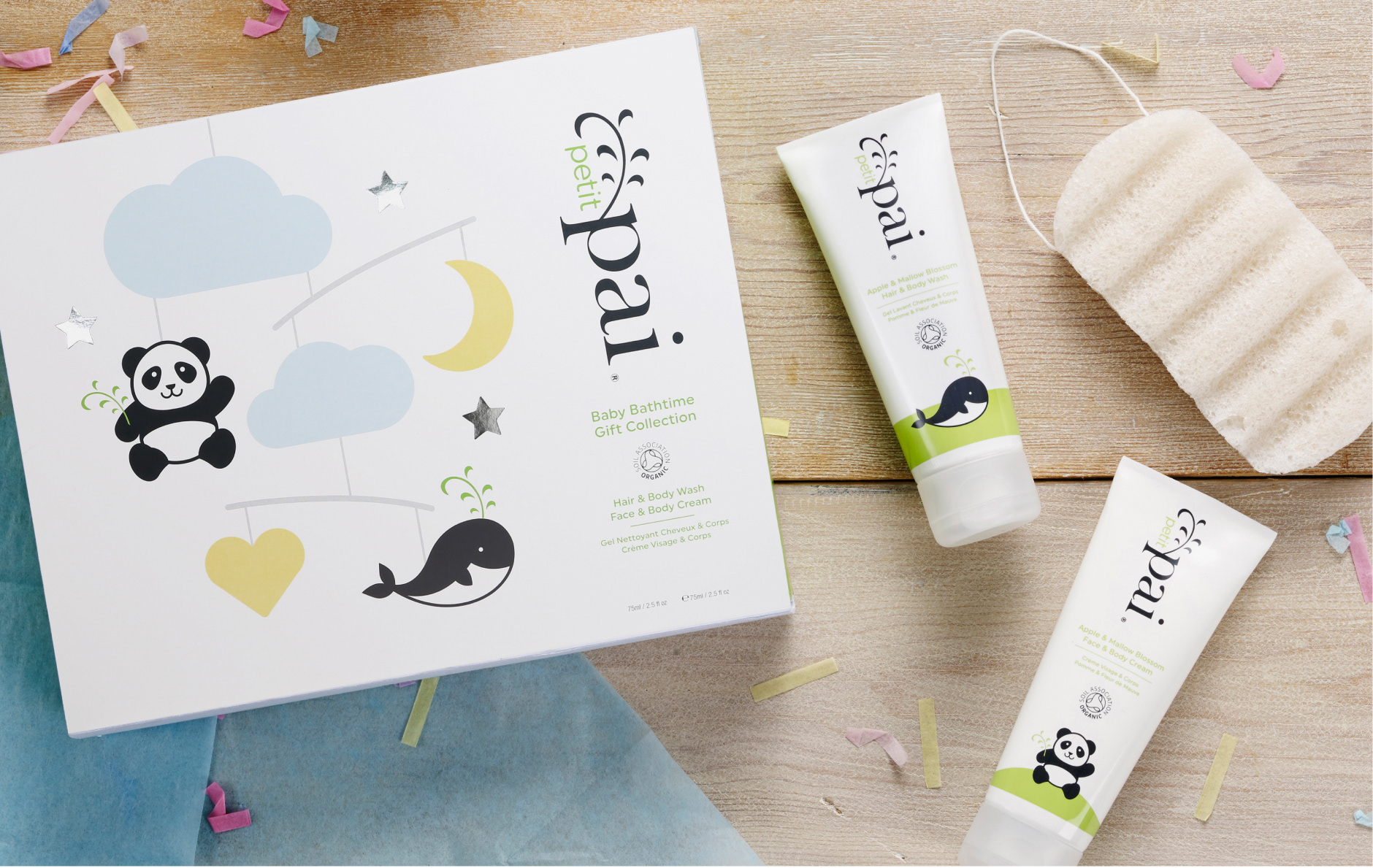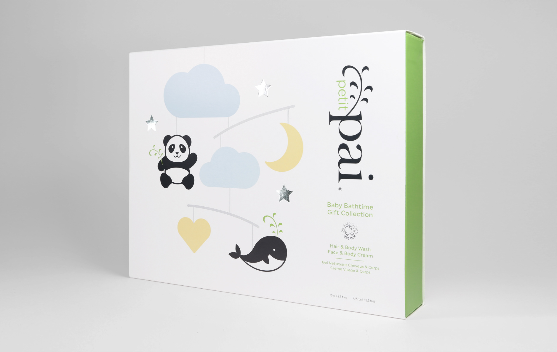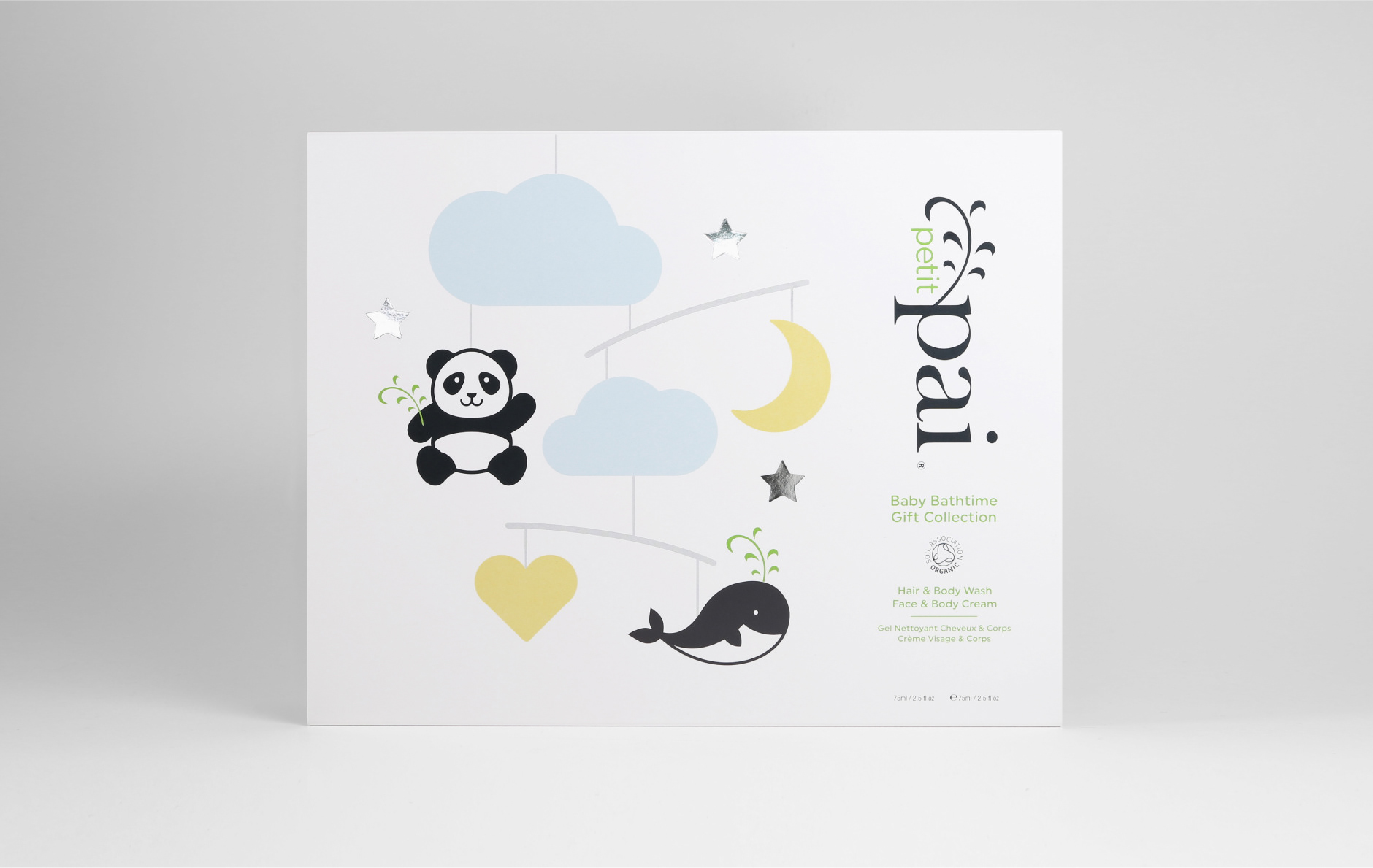 A fun, distinctive and premium gift pack for Pai Skincare's baby and toddler collection. The product idea of 'bath and bedtime' is reinforced with the use of a baby mobile motif that incorporates the two animal characters originally designed for the products contained within the collection.